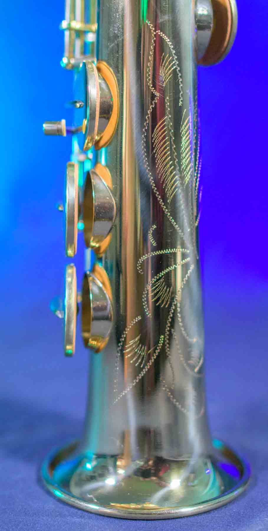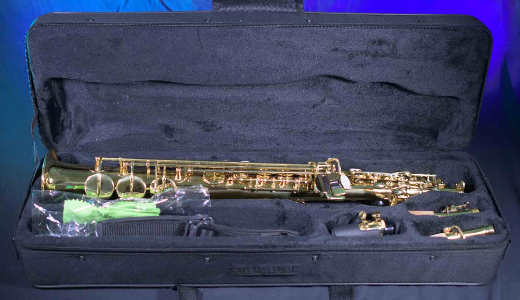 This soprano saxophone is brand new. Perfect for anyone wanting a soprano. Factory fresh, this horn is quality built with a hybrid of post to body and ribbed construction, making a perfect blend of sound, durability and weight. Beautiful brass with a lacquer finish and a nice engraving give this horn a special look. Has high f sharp key for advancing players.