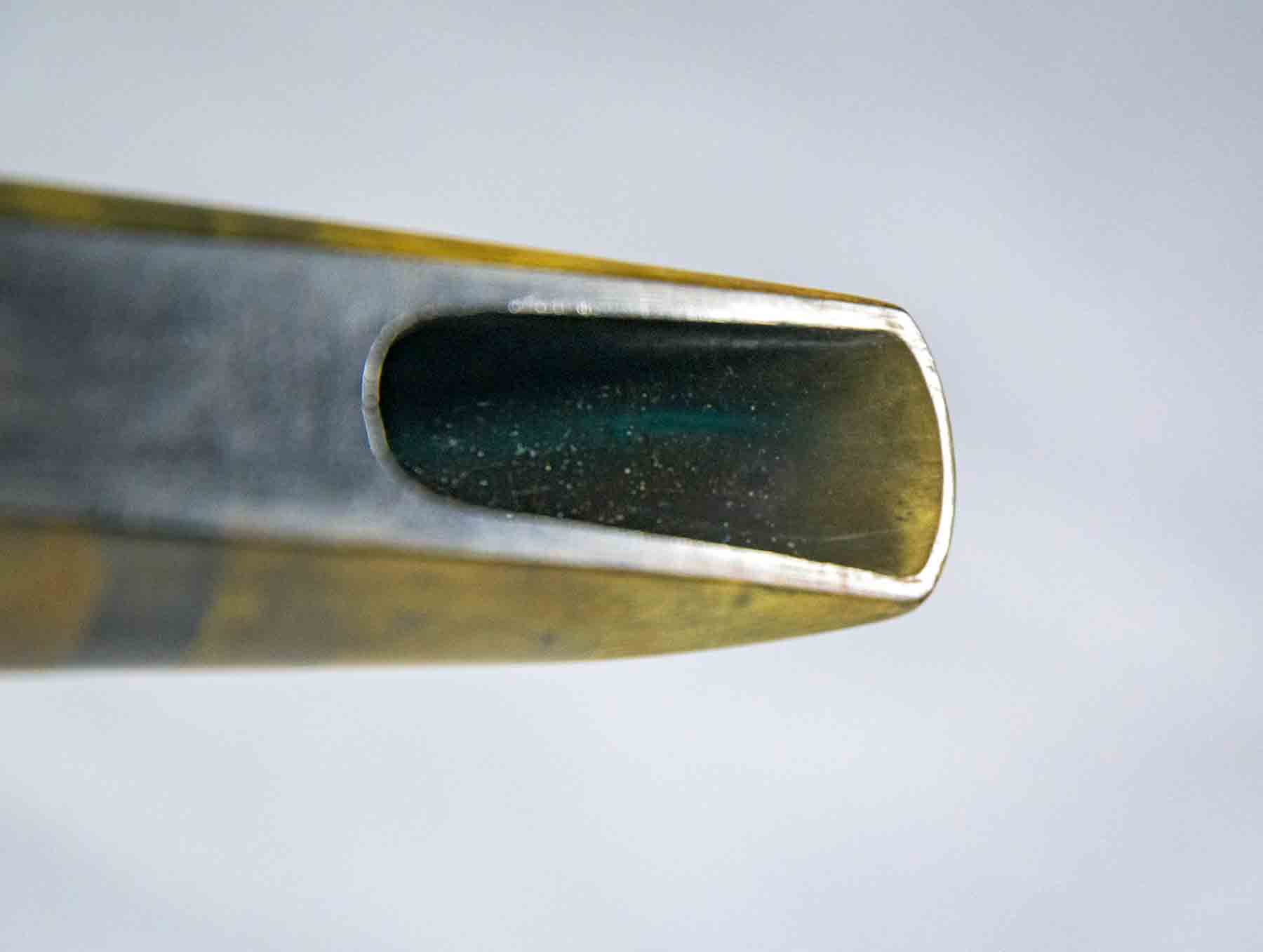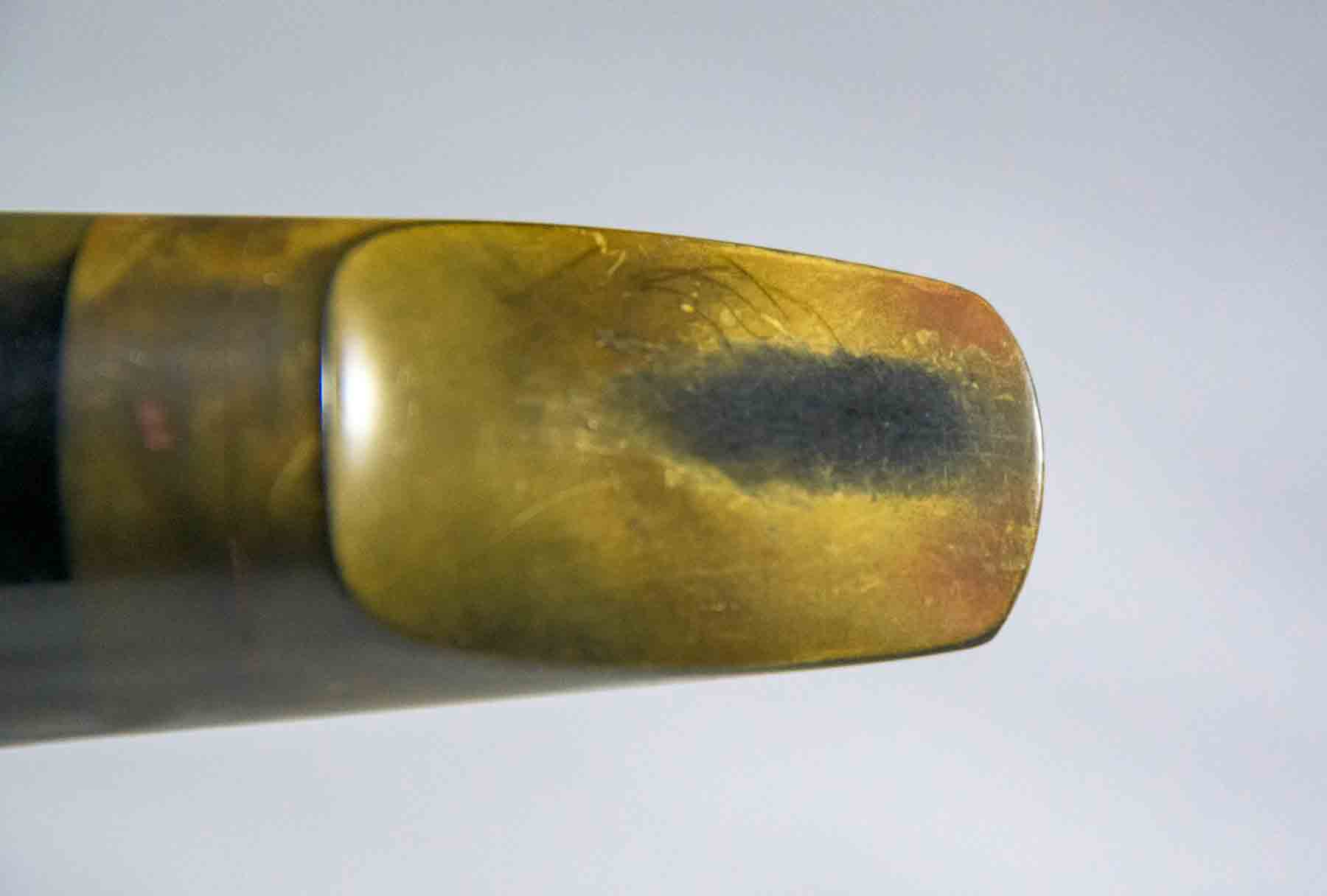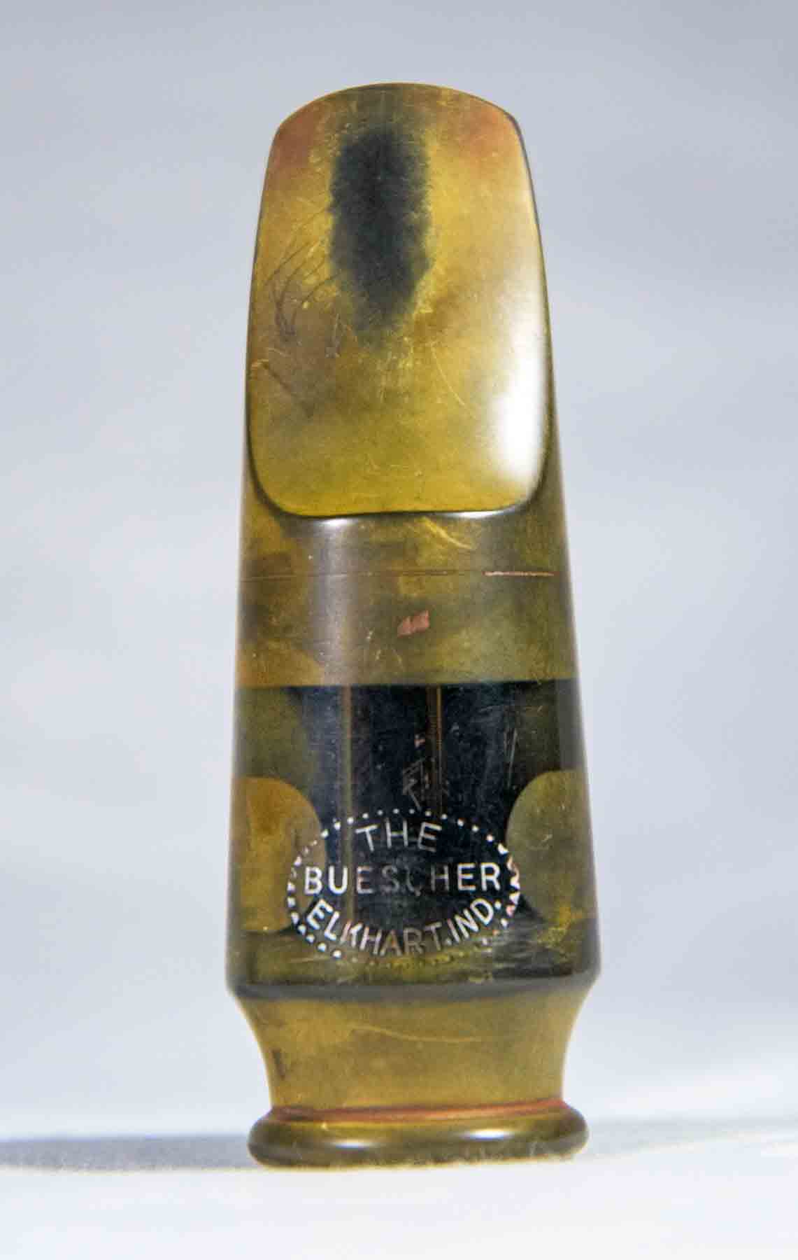 This Buescher alto mouthpiece originally came with a 1938 Art Deco slant logo Aristocrat saxophone. It is made of hard rubber and is in very good condition. It gas a tip opening of .041″ and an open chamber giving this mouthpiece a warm rich sound. The olive-brown “patina” is a natural occurrence for vintage hard rubber as it ages and is exposed to light or moisture. This discoloration is cosmetic and generally does not affect its playing qualities.