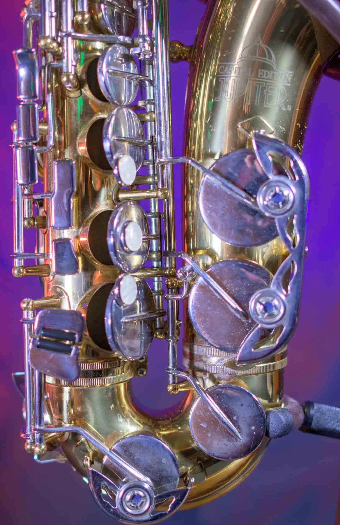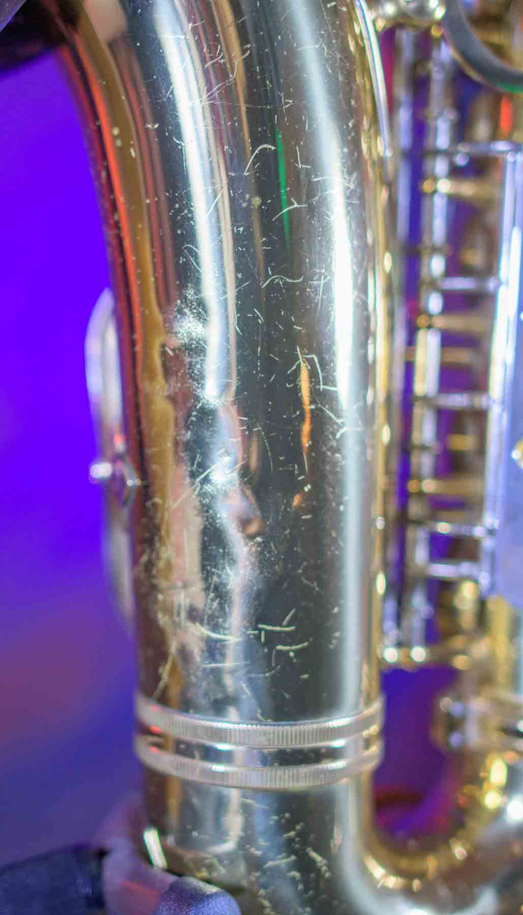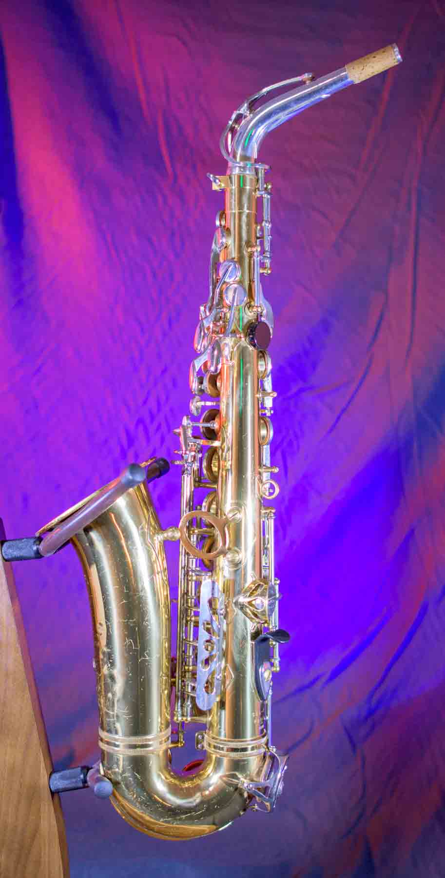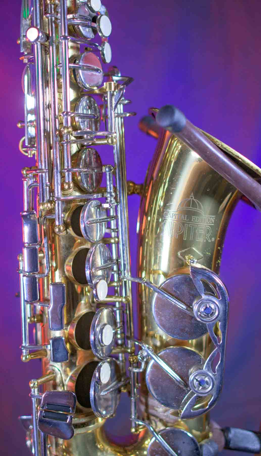 The Capital Edition by Jupiter is a very well respected saxophone. They have a solid sterling silver neck which aids in its free blowing playablity and its warm sound. When this one came into our shop it was not in very good condition. It has a dent on the bell, several keys were bent and most of the pads were beyond use. We replaced all of the pads, cleaned and lubed the action and set up the horn and it is now ready for its first gig. We can repair almost any problem with saxophones, but we don’t do dent repair, so the dent remains (see pictures). It is purely cosmetic and is reflected it the price. This horn plays like a new horn is very hard tom put down.