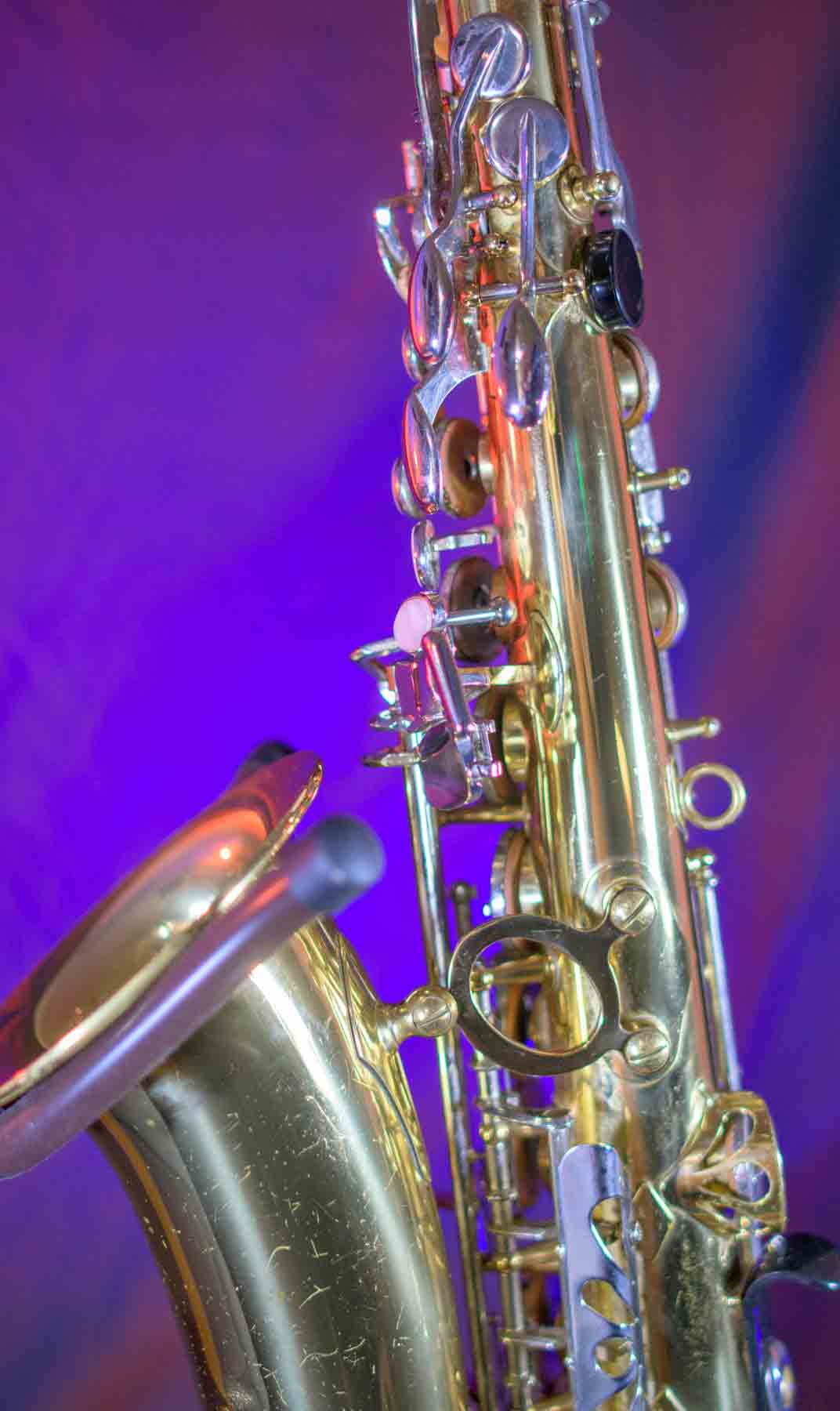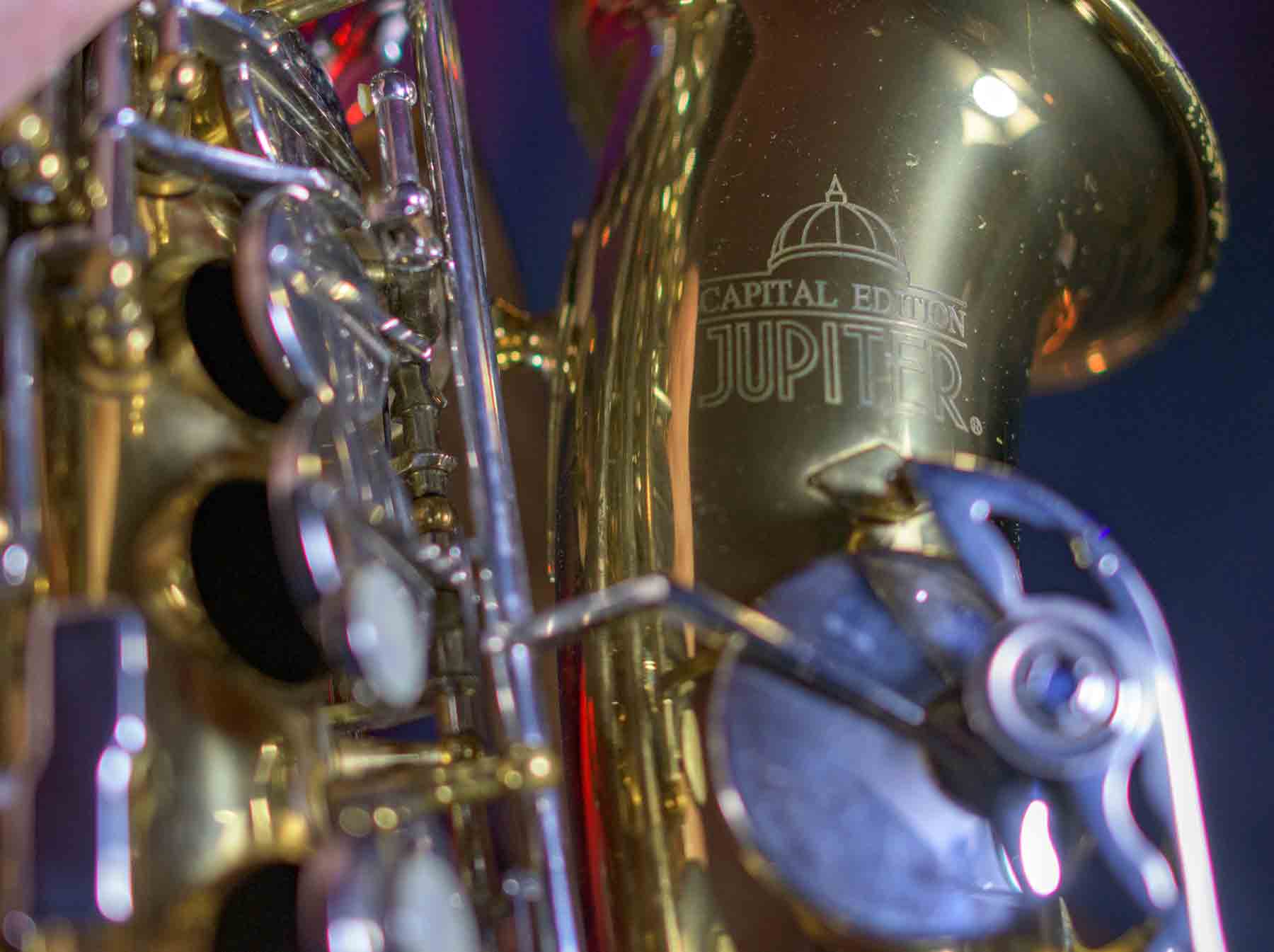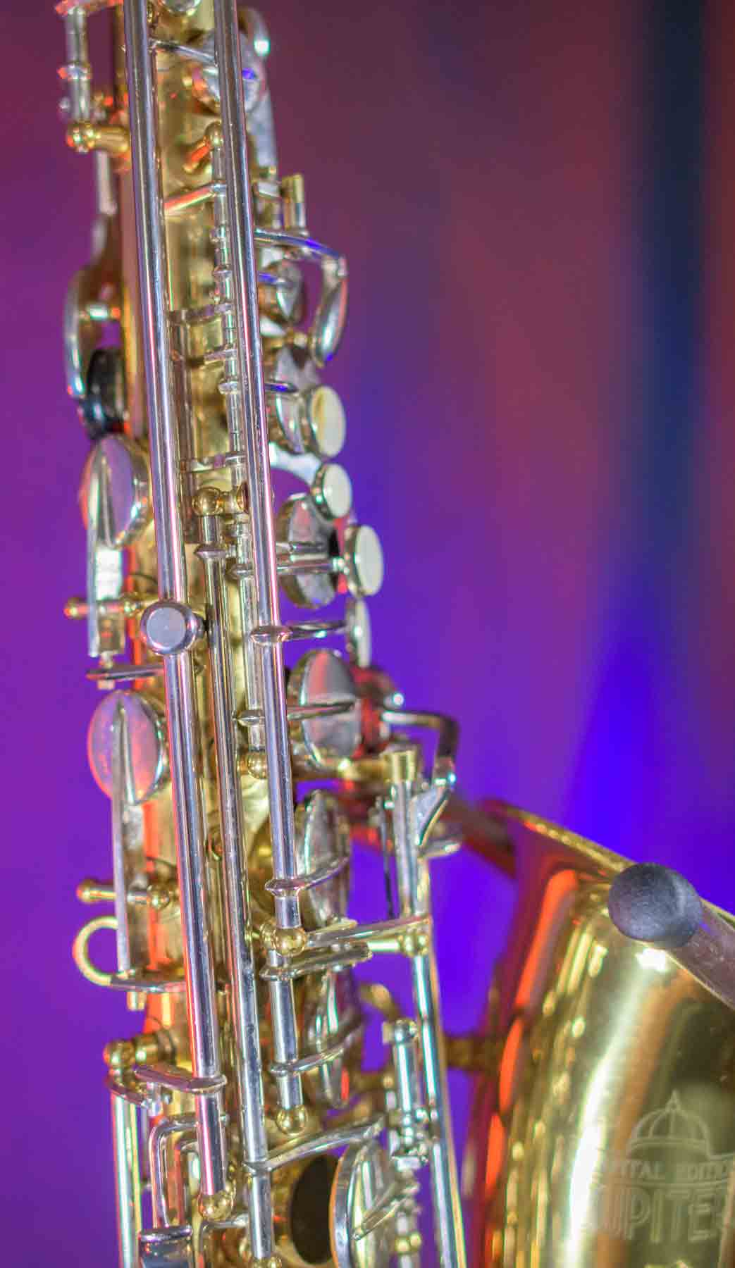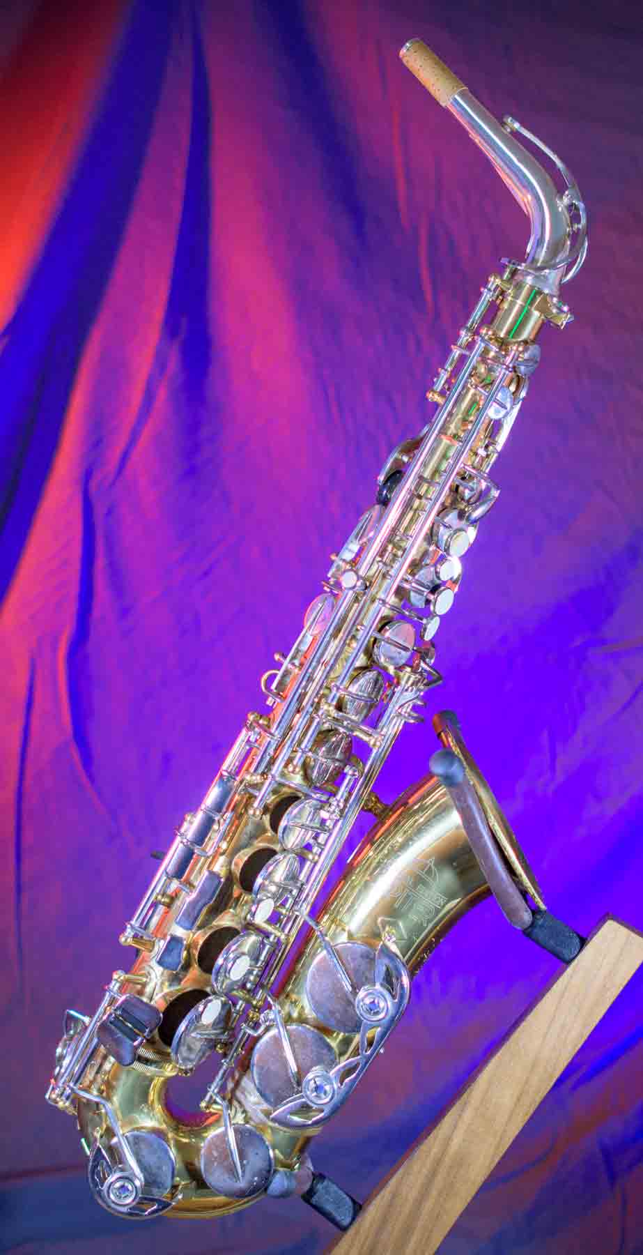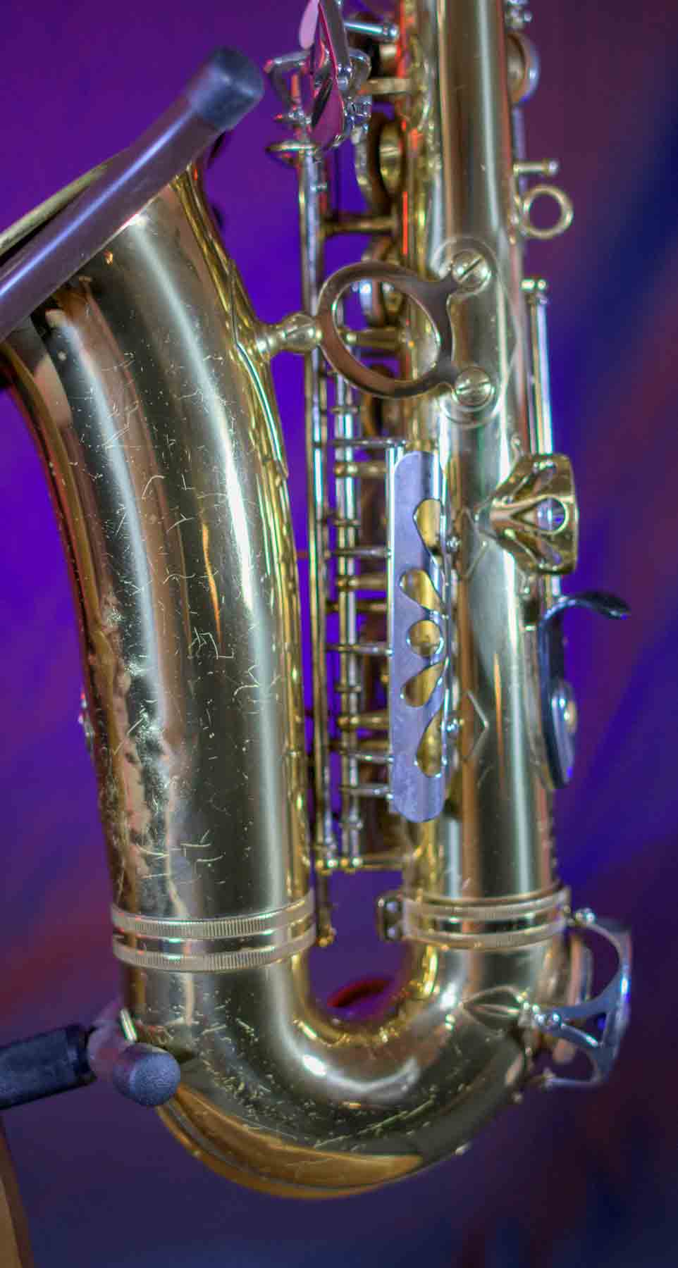 The Capital Edition by Jupiter is a very well respected saxophone. They have a solid sterling silver neck which aids in its free blowing playablity and its warm sound. When this one came into our shop it was not in very good condition. It has a dent on the bell, several keys were bent and most of the pads were beyond use. We replaced all of the pads, cleaned and lubed the action and set up the horn and it is now ready for its first gig. We can repair almost any problem with saxophones, but we don’t do dent repair, so the dent remains (see pictures). It is purely cosmetic and is reflected it the price. This horn plays like a new horn is very hard tom put down.