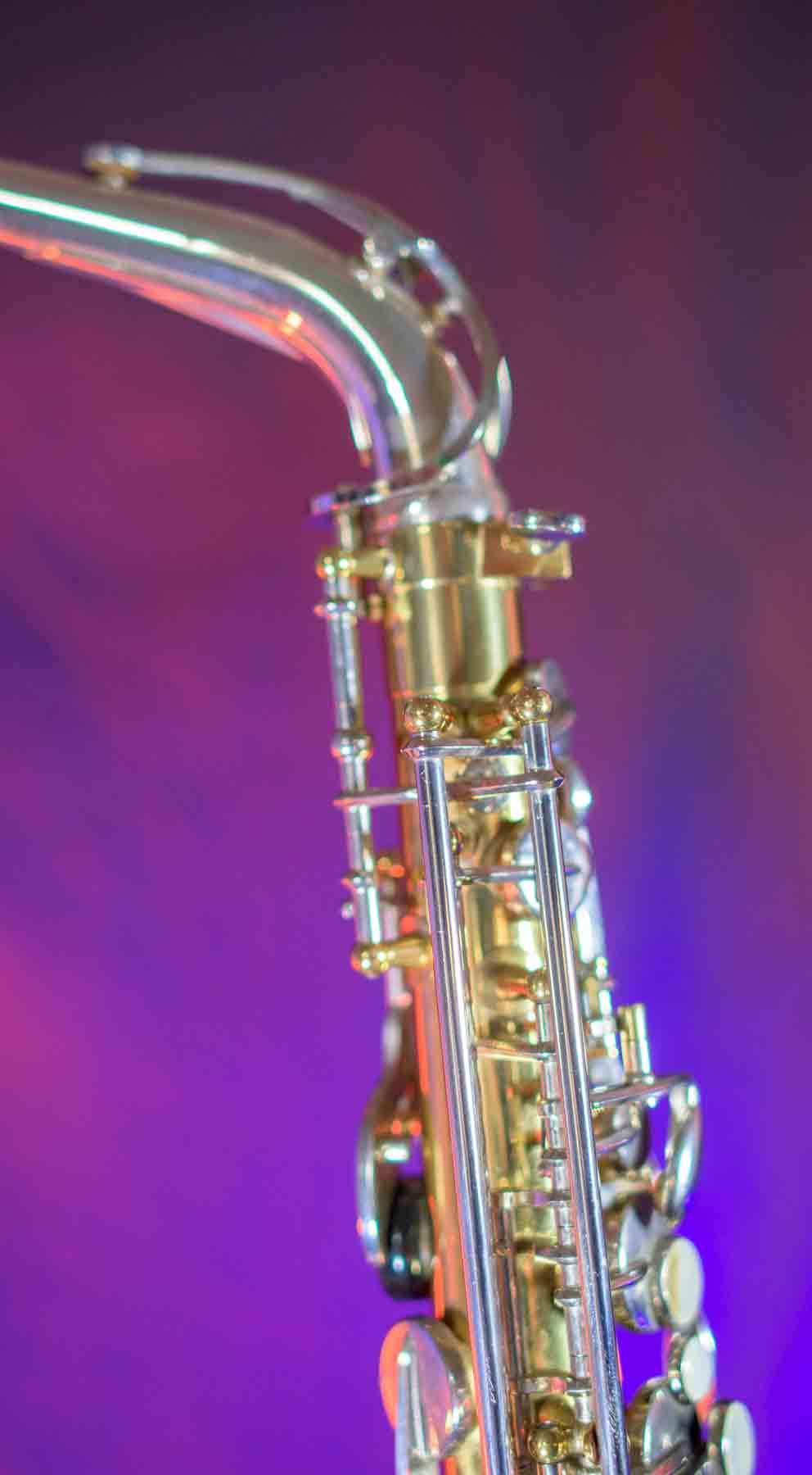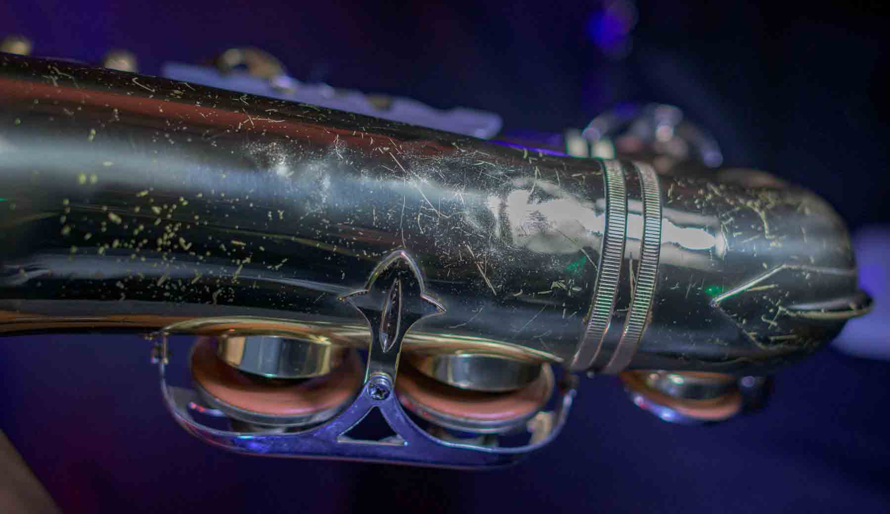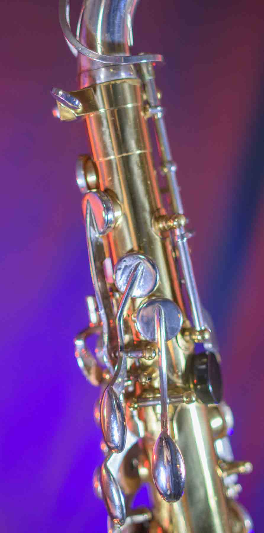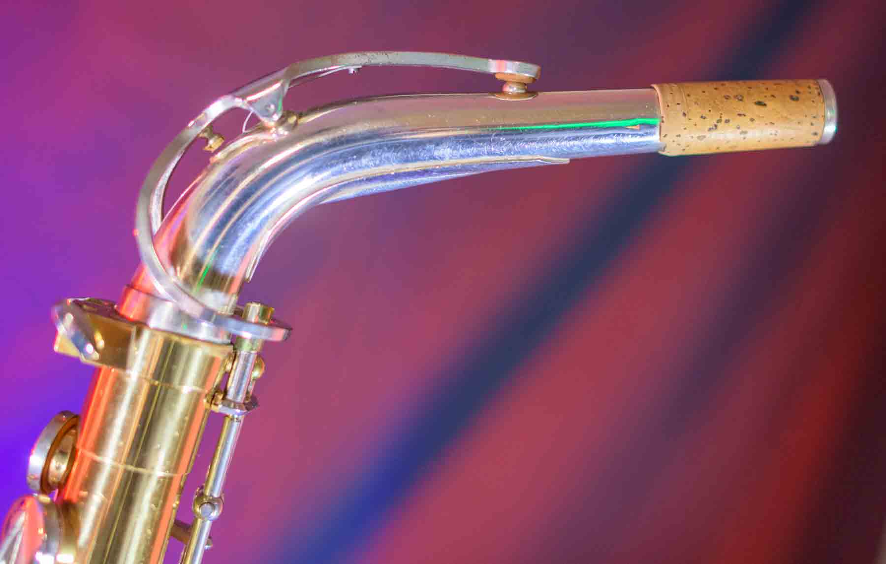 The Capital Edition by Jupiter is a very well respected saxophone. They have a solid sterling silver neck which aids in its free blowing playablity and its warm sound. When this one came into our shop it was not in very good condition. It has a dent on the bell, several keys were bent and most of the pads were beyond use. We replaced all of the pads, cleaned and lubed the action and set up the horn and it is now ready for its first gig. We can repair almost any problem with saxophones, but we don’t do dent repair, so the dent remains (see pictures). It is purely cosmetic and is reflected it the price. This horn plays like a new horn is very hard tom put down.