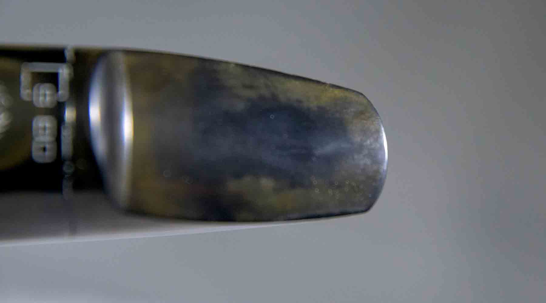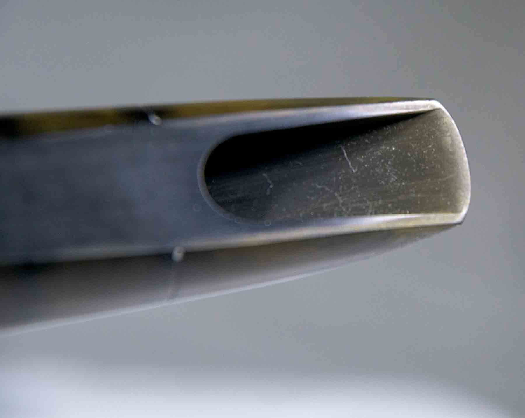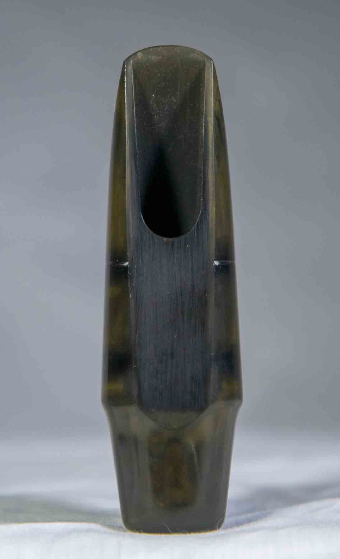 This Selmer S-80 mouthpiece is in very good condition. It has a small tooth dimple on the break, other than that it is like new. The olive-brown “patina”  is a natural occurrence for vintage hard rubber as it ages and is exposed to light or moisture. This discoloration is cosmetic and generally does not affect its playing qualities. opening is .063″.